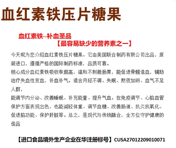 【產(chǎn)品名稱】:血紅素鐵壓片糖果 進口產(chǎn)品