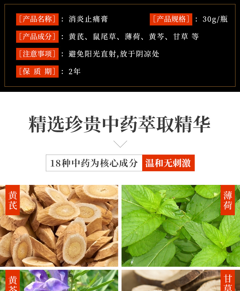 產品說明:消炎止痛膏主要是消炎、止痛、止癢、驅風鎮(zhèn)痛,通竅消腫,活血止痛;由黃芪提取液、快樂鼠尾草精油、薄荷油、肉桂油、血竭、黃芩、甘草、香蘭基丁基醚等調配而成。