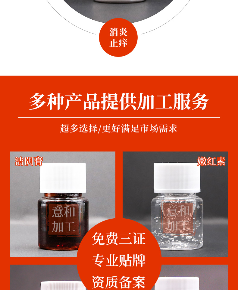 廣州意和生物科技有限公司是一家集消炎止痛膏、縮陰液、私密T膜、中藥護墊,婦科凝膠、私密產品、化妝品OEM/ODM加工為一體的大型集團,是華南地區(qū)為數不多的消字號,妝字號,械字號證件齊全的公司。擁有三萬平方生產基地,配備獨立研發(fā)、倉儲中心,擁有國內進口生產、研發(fā)、檢測設備,車間凈化達歐盟標準,空氣質量達國家藥品級加工標準。公司的生產廠房擁有現代化生產以及全自動設備。集設計、生產和銷售與一體,設有樣展中心,GMPC生產車間,廠房設6條機械化生產流水線,擁有技術先進的高精分析測試儀器等。在技術上公司投入人力,加大產品的標準化研究,形成了產品核心競爭力,使公司的產品質量保證體系穩(wěn)固、堅實。