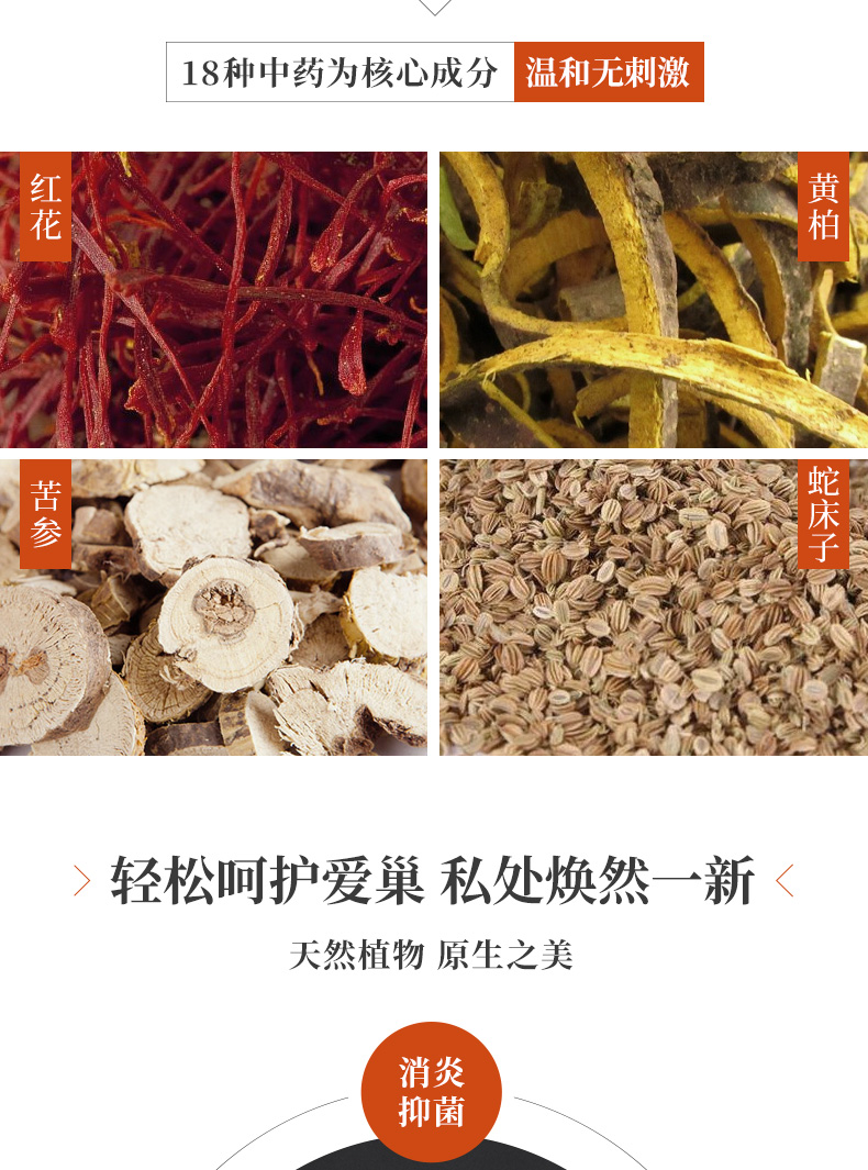 水、紅花(Carthamus tinctorius L.)、蛇床子(Cnidium monniere (L.) Cuss.)、蘆薈(Aloe vera)、黃柏(Phellodendron chinense Schneid,)、苦參(Sophora flavescens Ait.)、薄荷腦、乳酸桿菌/梨汁發(fā)酵產(chǎn)物濾液、醋酸氯己定等