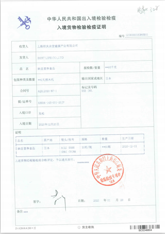 納豆激酶 配料表:葵花籽油、 明膠、納豆粉、甘油、乳化劑(大豆磷脂) 原產(chǎn)國:日本 規(guī)格:14.25g(475mg*30粒) 生產(chǎn)日期: xxxx年xx月xx日 保質(zhì)期(至):xxxx年xx月xx日 貯藏條件:避免陽光直射,干燥陰涼處保存 中國經(jīng)銷商:上海艾啟實(shí)業(yè)有限公司 地址:上海市嘉定區(qū)安亭鎮(zhèn)墨玉南路1080號(hào)5層508室JT181 電話:021-31156853 營養(yǎng)成分表 項(xiàng)目 每100g NRV% 能量 2435kJ 29% 蛋白質(zhì) 28.1g 47% 脂肪 40.8g 68% 碳水化合物 25.6g 9% 鈉 47(mg) 2% 每粒含納豆激酶4020FU